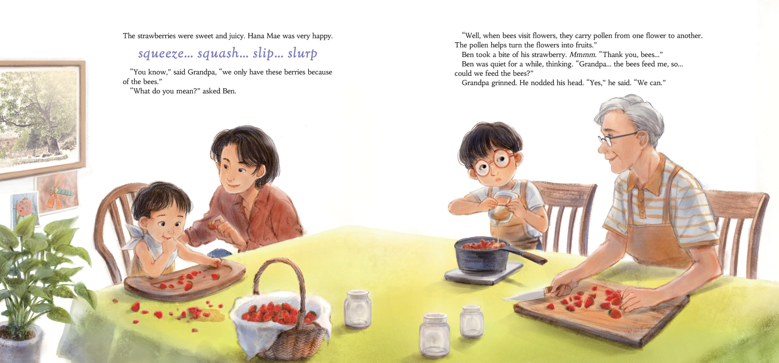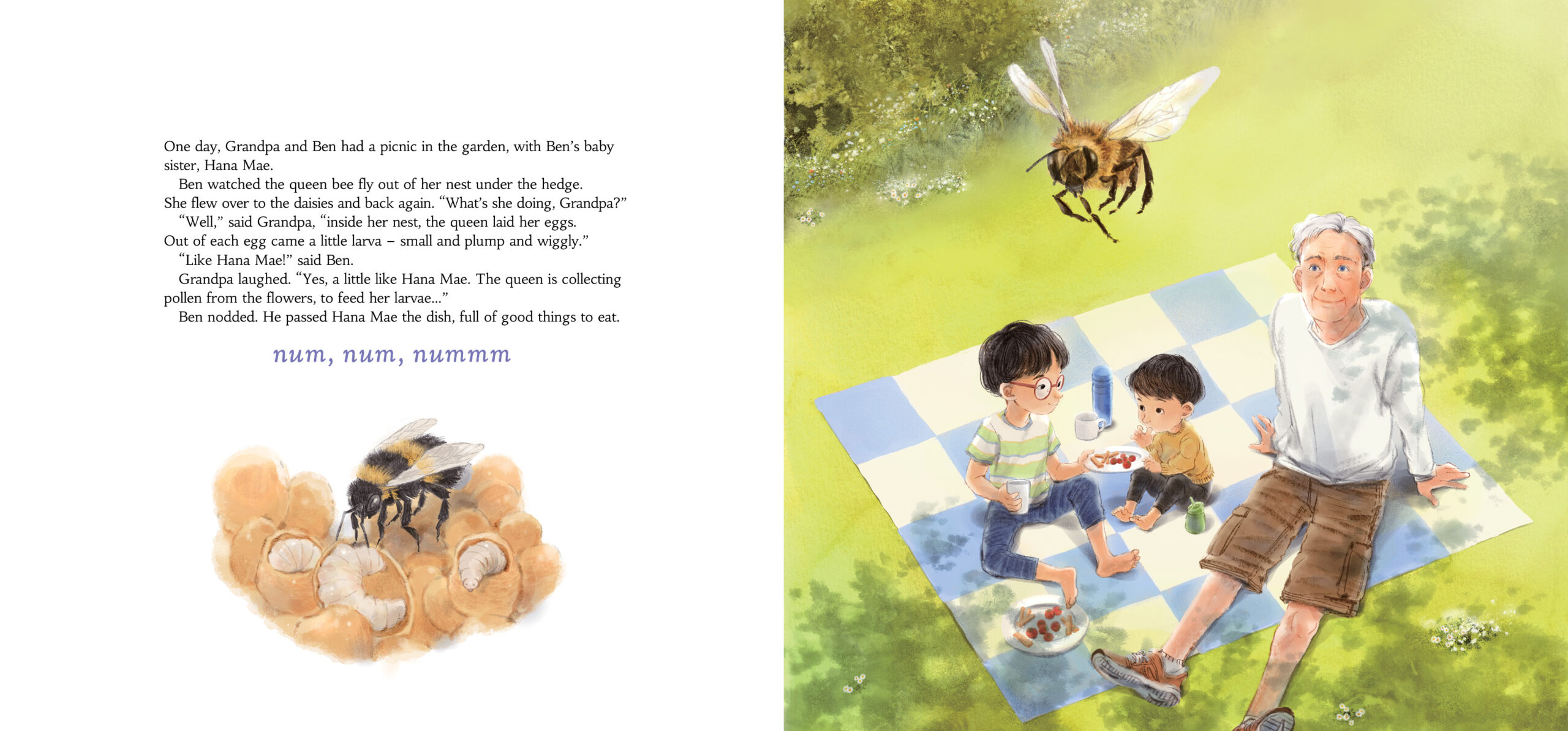 I love all of them! One of my favourites is the illustration where Grandpa, Ben and Hana Mae are relaxing in the back garden. I enjoyed drawing all the details of a bumblebee flying above them in this illustration. The illustration of the kitchen with Grandpa, Ben, Hana Mae and mum is another favourite. This illustration is full of warmth and it always makes me smile seeing Hana Mae messily enjoying the strawberries.