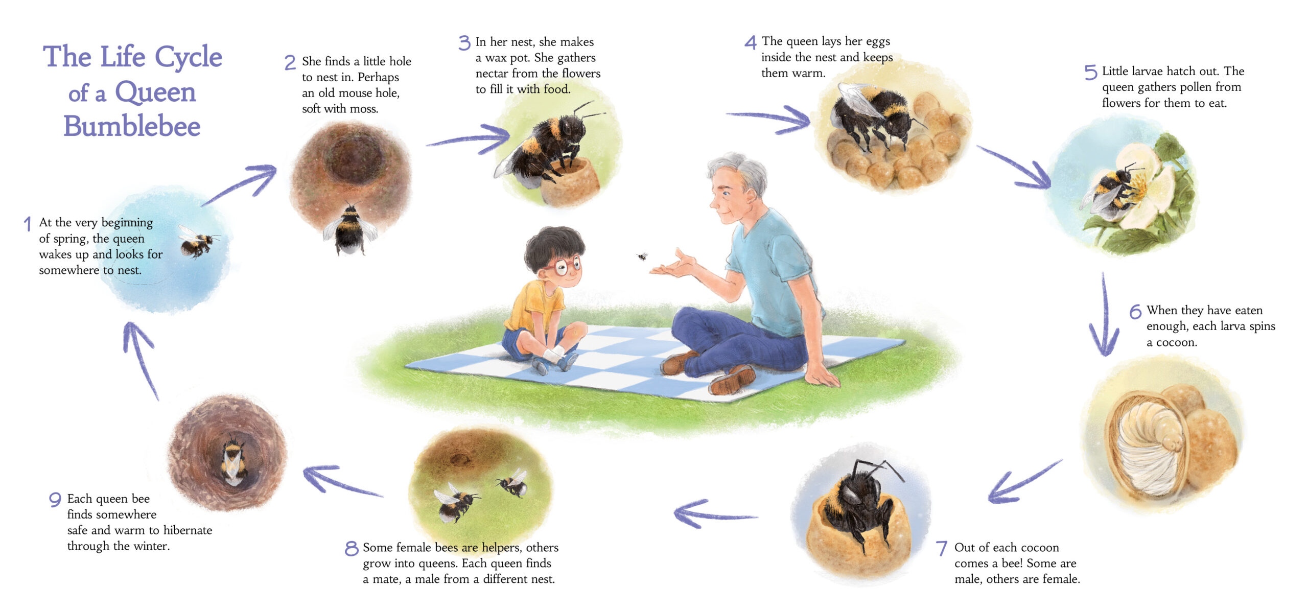 Was it challenging to depict all the various stages of a bumblebee’s life cycle?