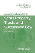 Avizandum Statutes on Scots Property, Trusts and Succession Law contains the main statutory provisions regulating post-feudal land law in Scotland. It covers both heritable and moveable property, as well as trusts and succession law. Key statutes include: Requirements of Writing (Scotland) Act 1985; Land Reform (Scotland) Ace 2003, Part 1; Title Conditions (Scotland) Act 2012; Charities and Trustee Investment (Scotland) Act 2005; Land Registration etc. (Scotland) Act 2012; and Succession (Scotland) Act 2016.