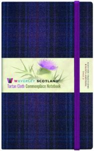 The Waverley Thistle Large Tartan cloth hardback (21 x 13cm) Notebook has 192 pages cream FSC acid-free paper, from sustainable forests and boards made from 100% recycled paper. The tartan colours are deep purple and green, with turquoise blue, dark burgundy, and dark charcoal. Left hand side page blank, right hand side page ruled. Made with Kinloch Anderson-designed cloth woven in mills in Great Britain. Pocket at the back for enclosures. Bookmark with history of tartan on one side and brief story of the tartan design on the other. Leaflet with map of Scotland, explanation of the history of tartan.